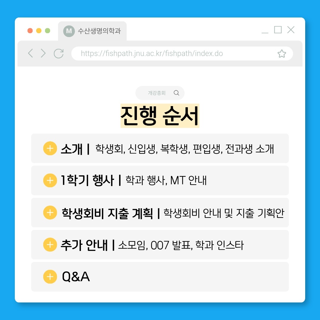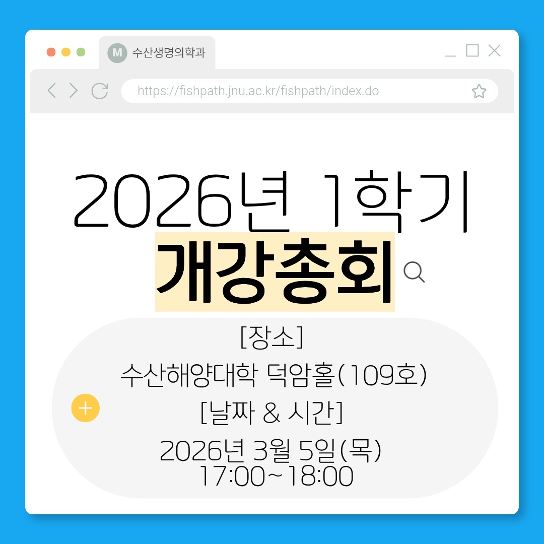 fnctId=bbs,fnctNo=396 글번호 973595 2026년 수산생명의학과 1학기 개강총회 안내 작성일 2026.03.04 수정일 2026.03.04 작성자 수산생명의학과 조회수 110 * 개강총회 후 뒷풀이는 18:30~ 조커닭에서 진행합니다. 첨부파일 첨부파일이(가) 없습니다.